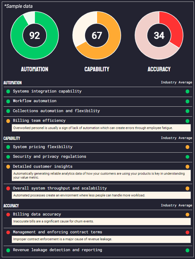 More than just time management, automation optimizes collections and dunning, improving your DSO. Its valuable aspects of error handling and contract enforcement go a long way in preventing revenue leakage. Respond to a few questions and uncover the health status of your current billing procedures.